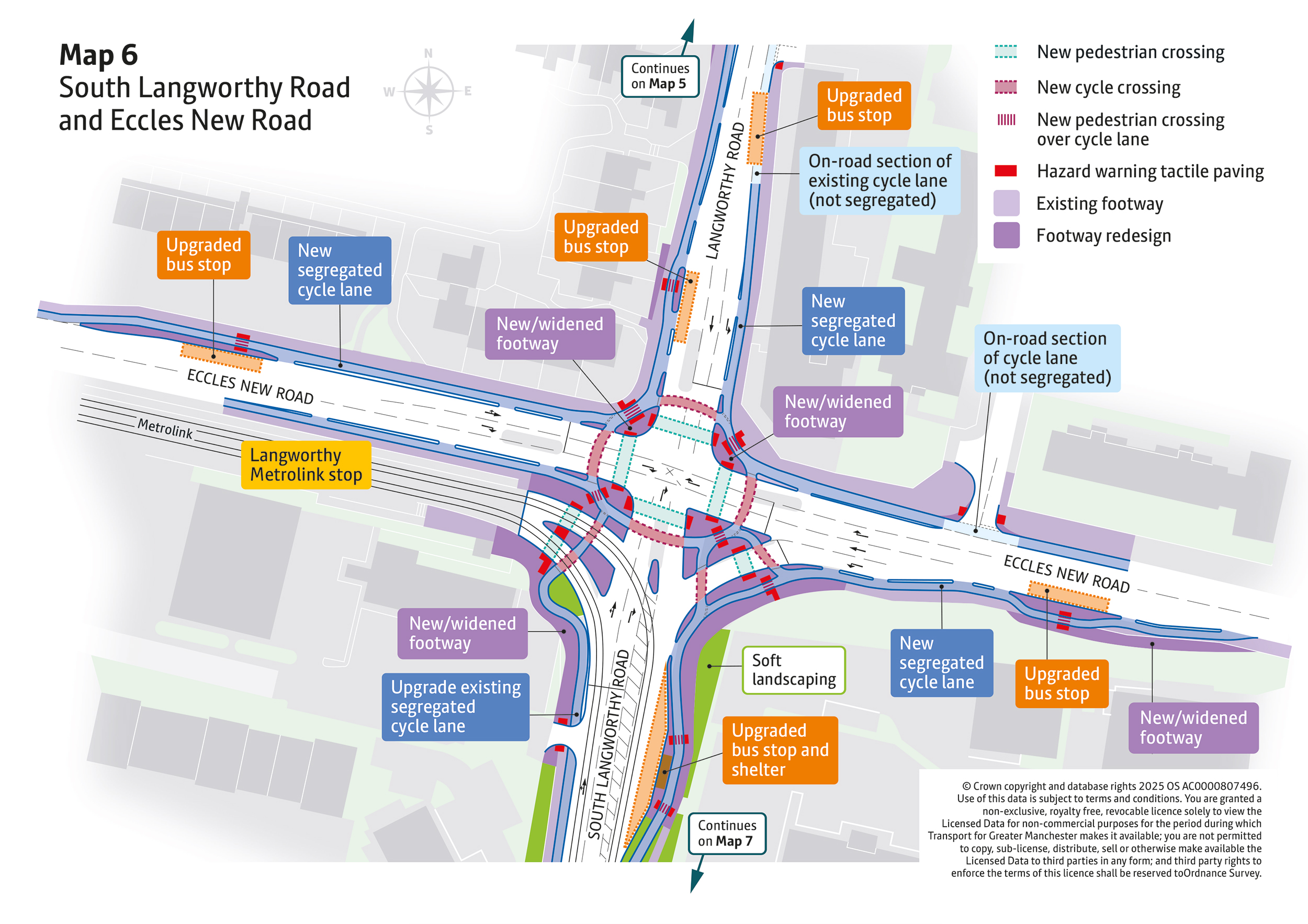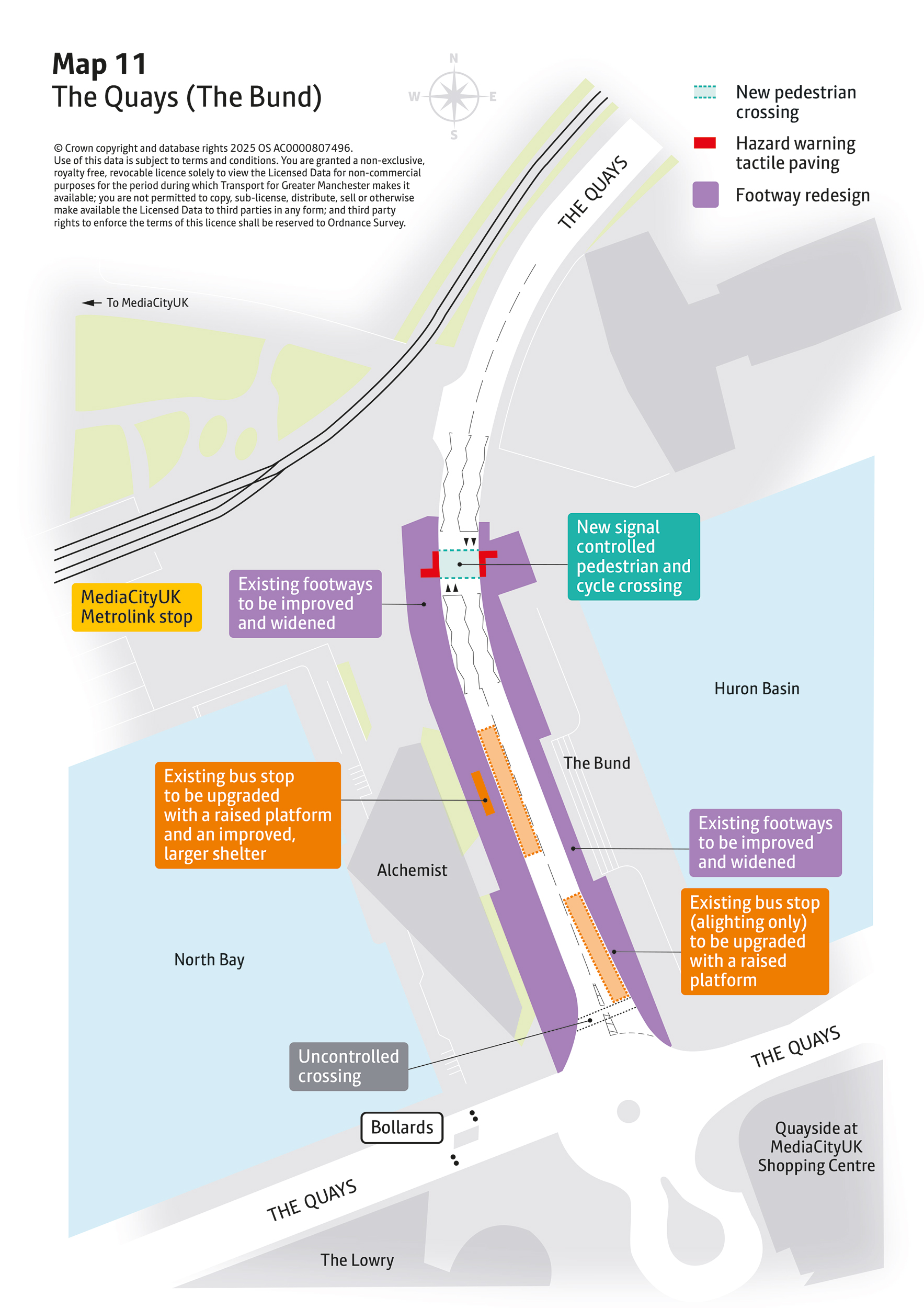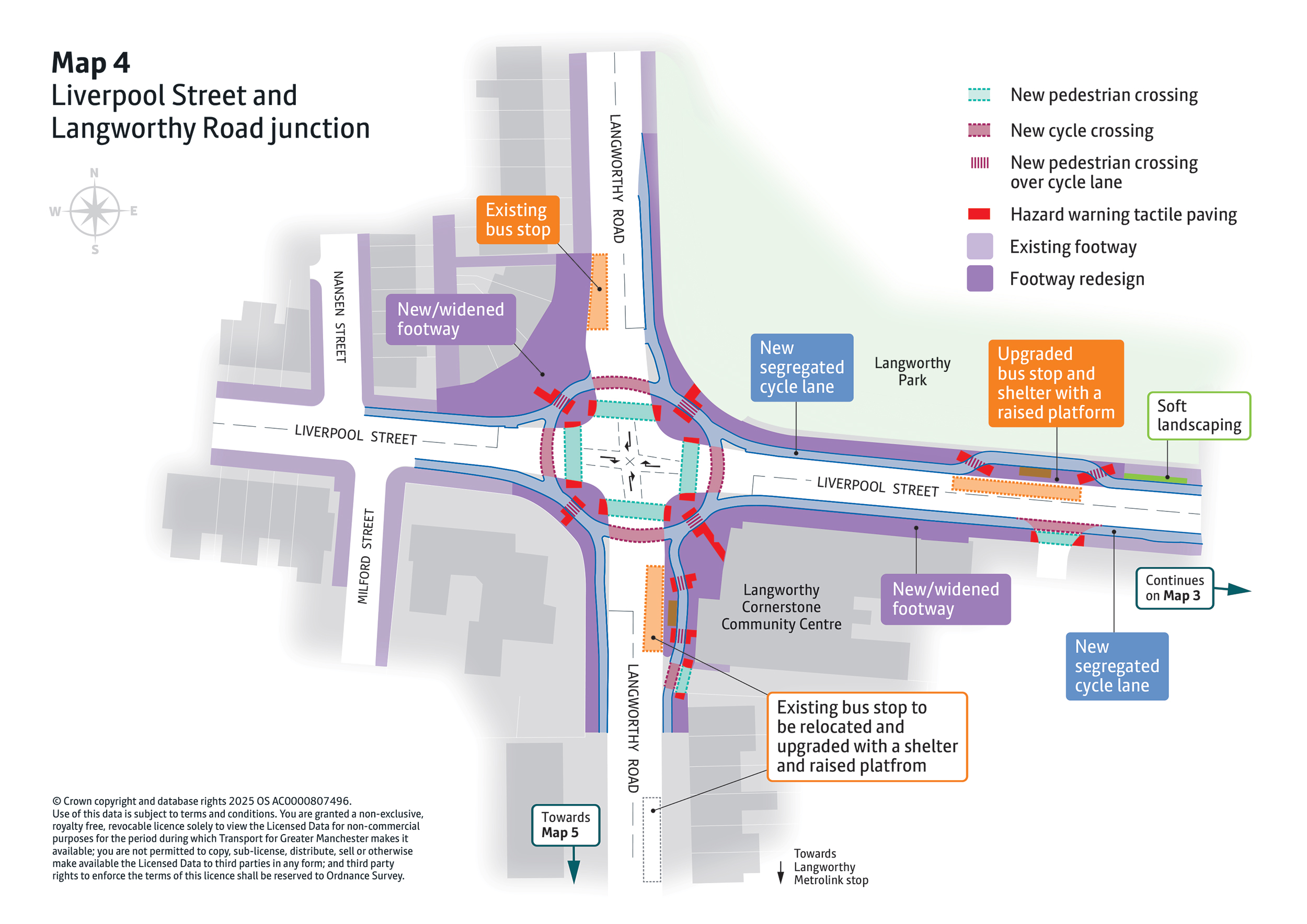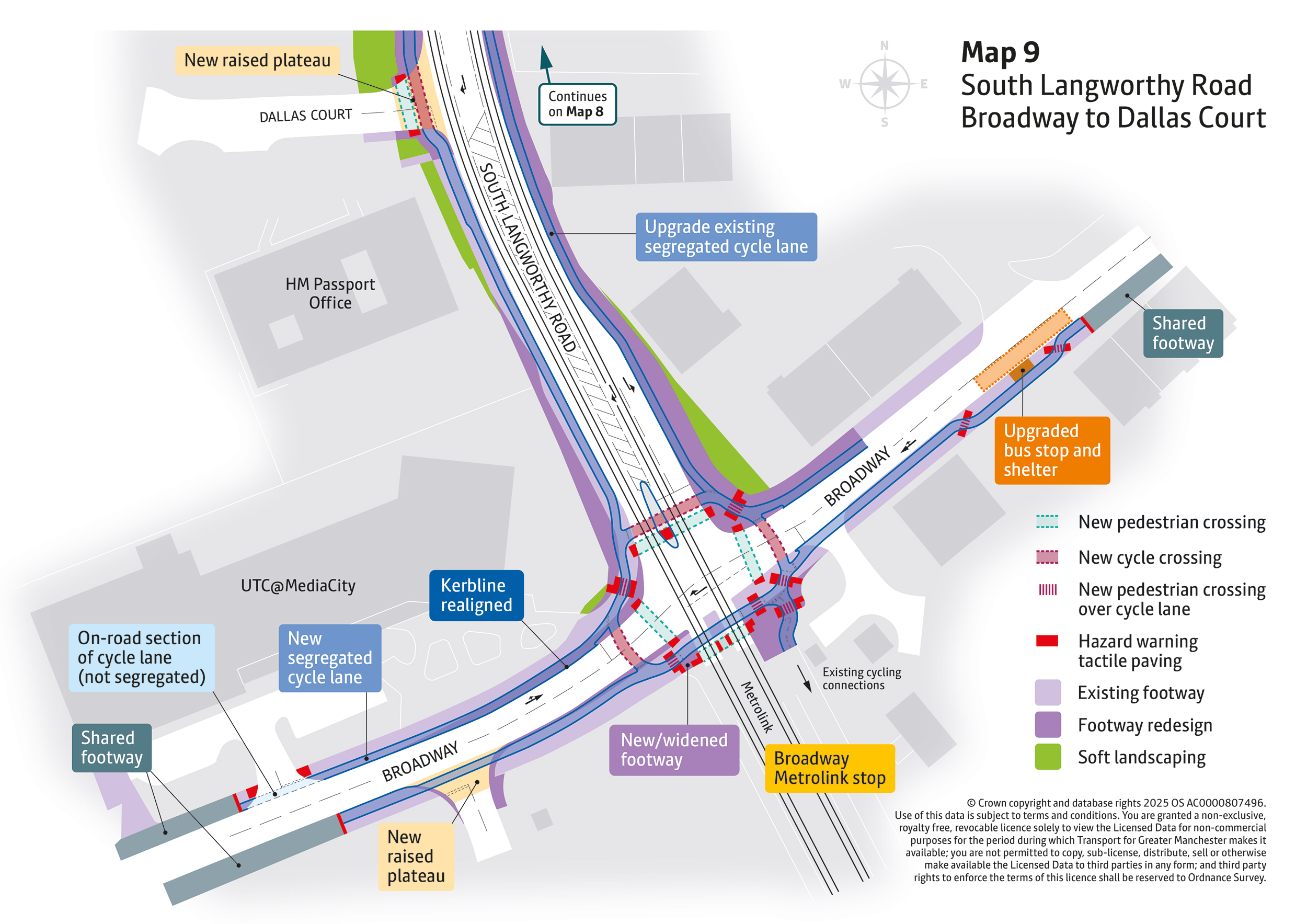 - New pedestrian and cycle crossings will be introduced at key locations including MediaCityUK, Broadway Roundabout, Langworthy Road, and Liverpool Street. These will make everyday walking, wheeling and cycling journeys safer and easier.