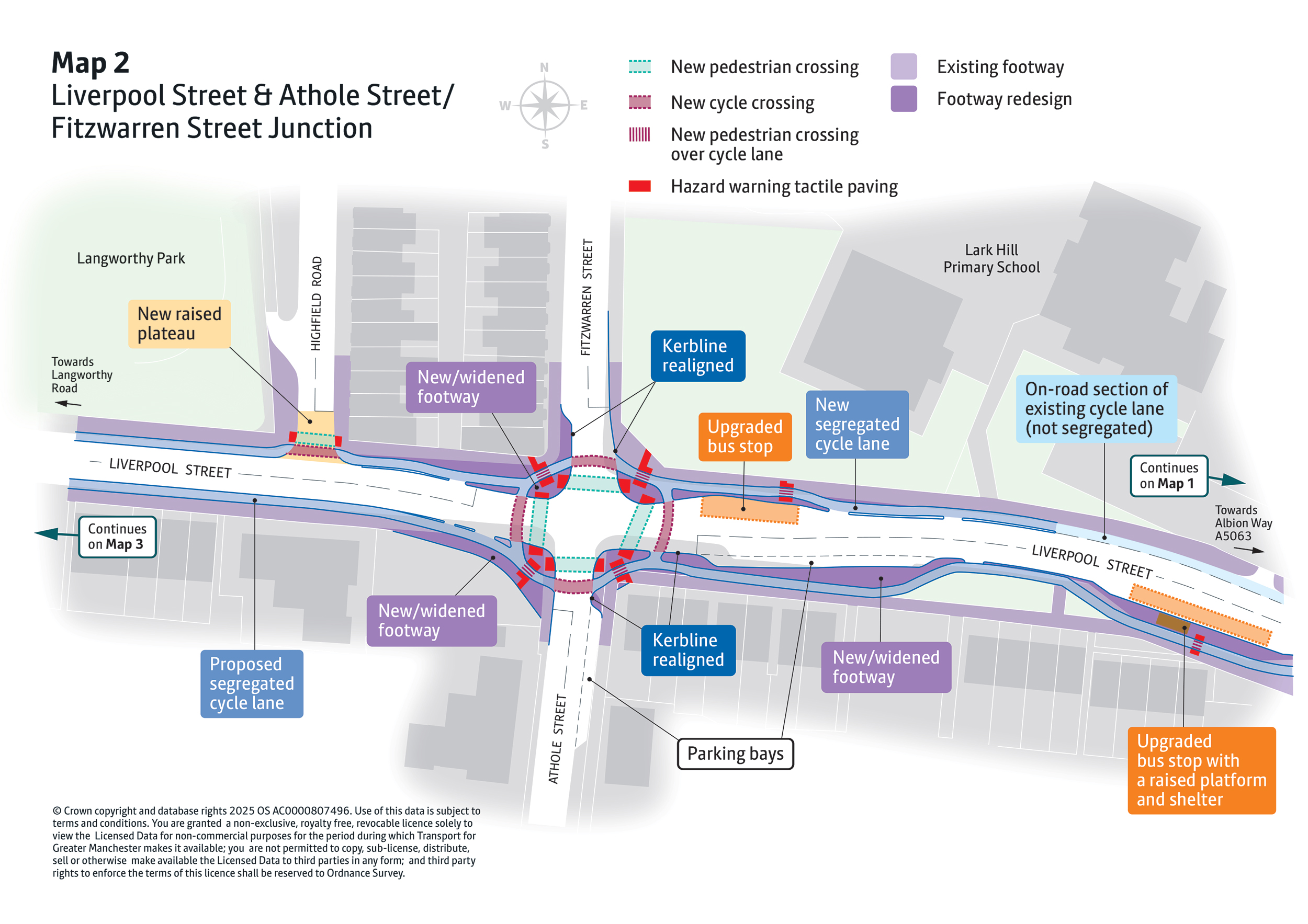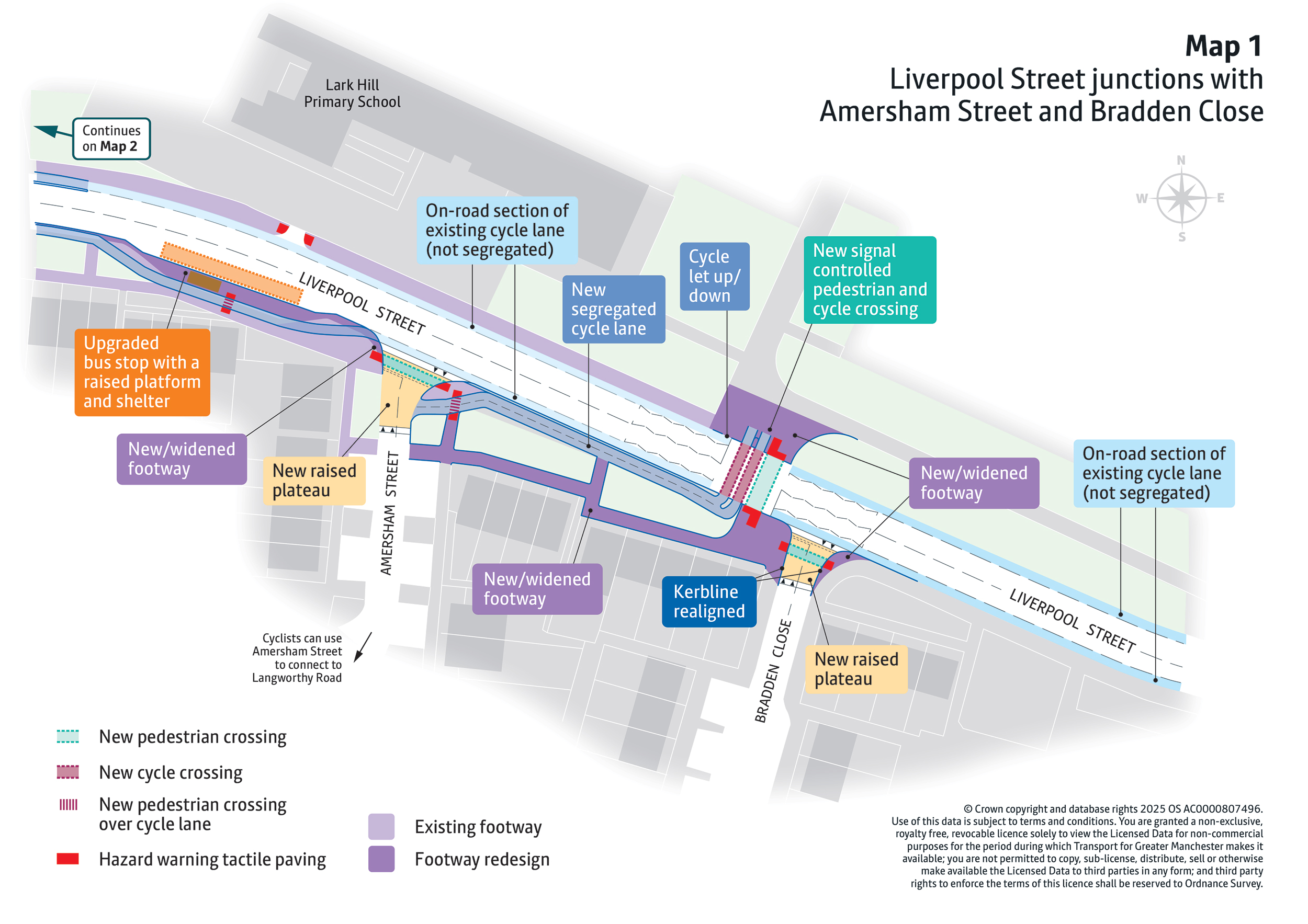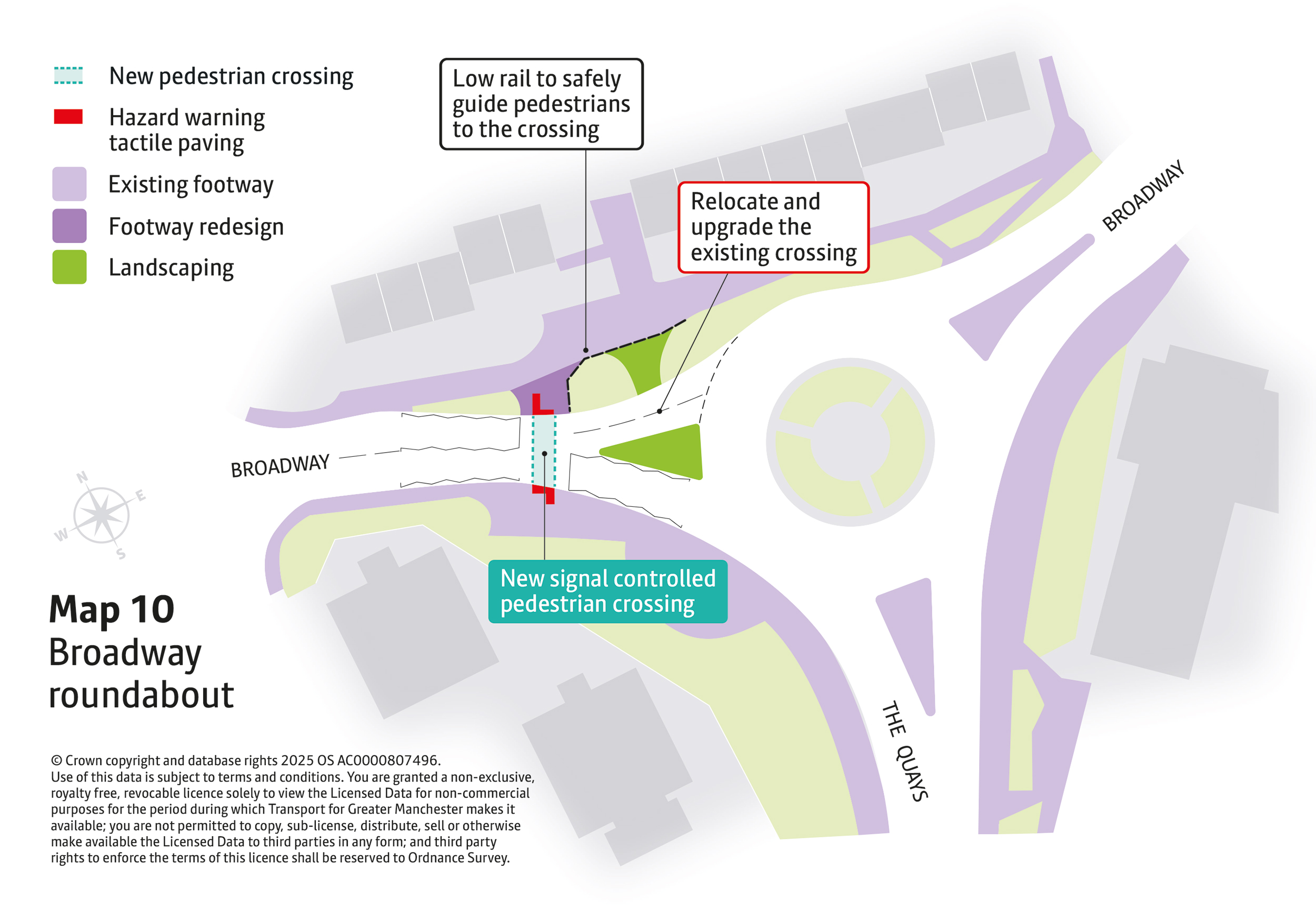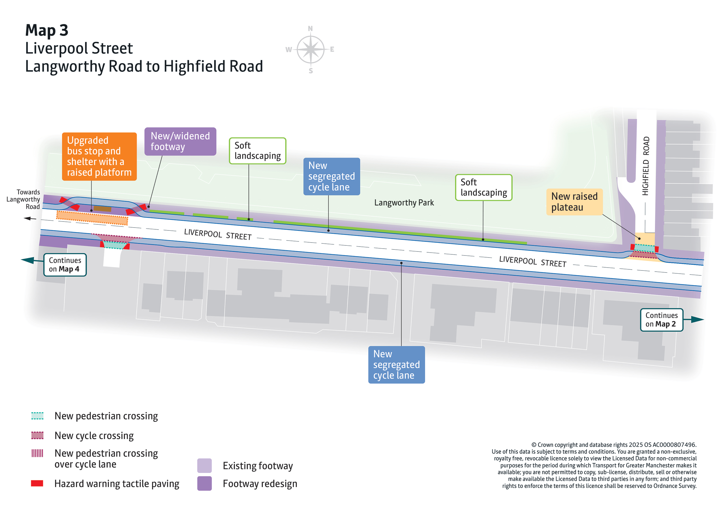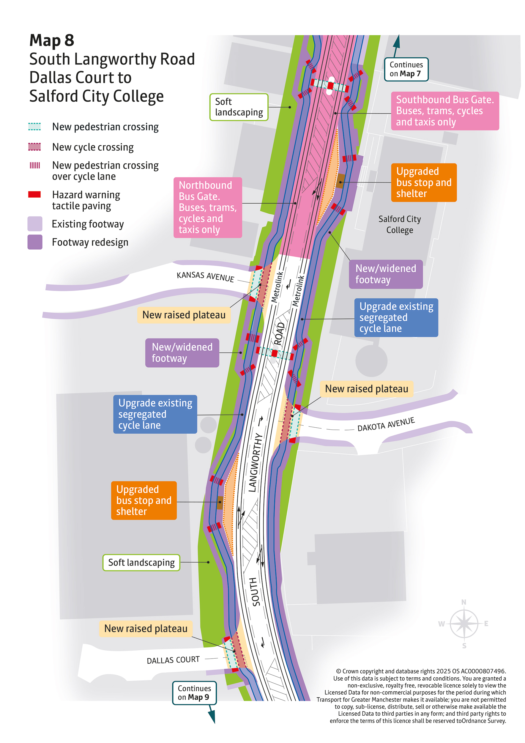 - New pedestrian and cycle crossings will be introduced at key locations including MediaCityUK, Broadway Roundabout, Langworthy Road, and Liverpool Street. These will make everyday walking, wheeling and cycling journeys safer and easier.