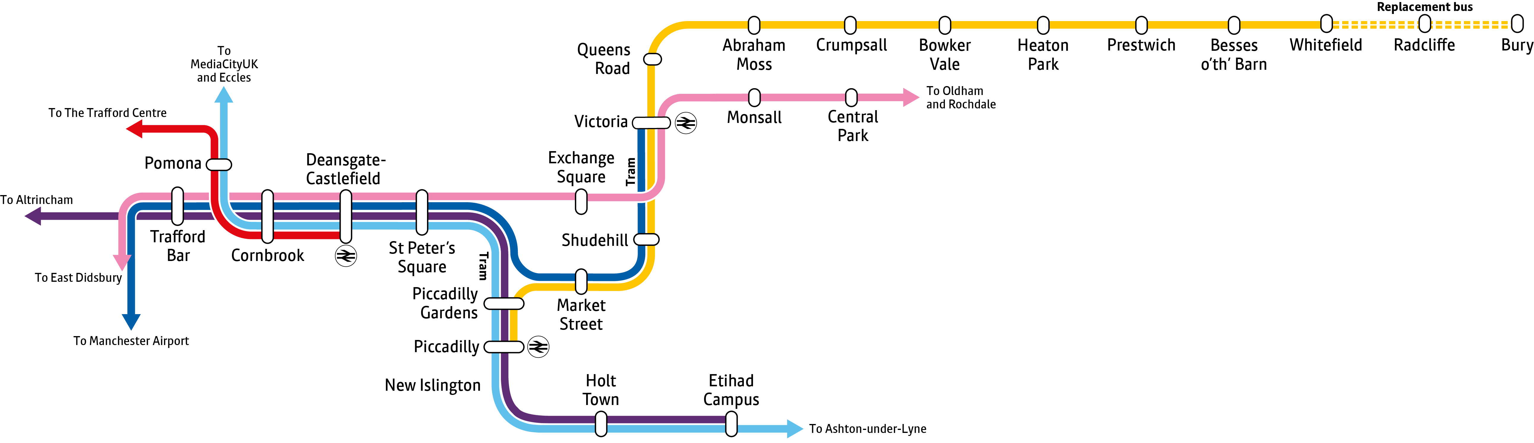 For the duration of the day, no trams will operate between Whitefield and Bury.