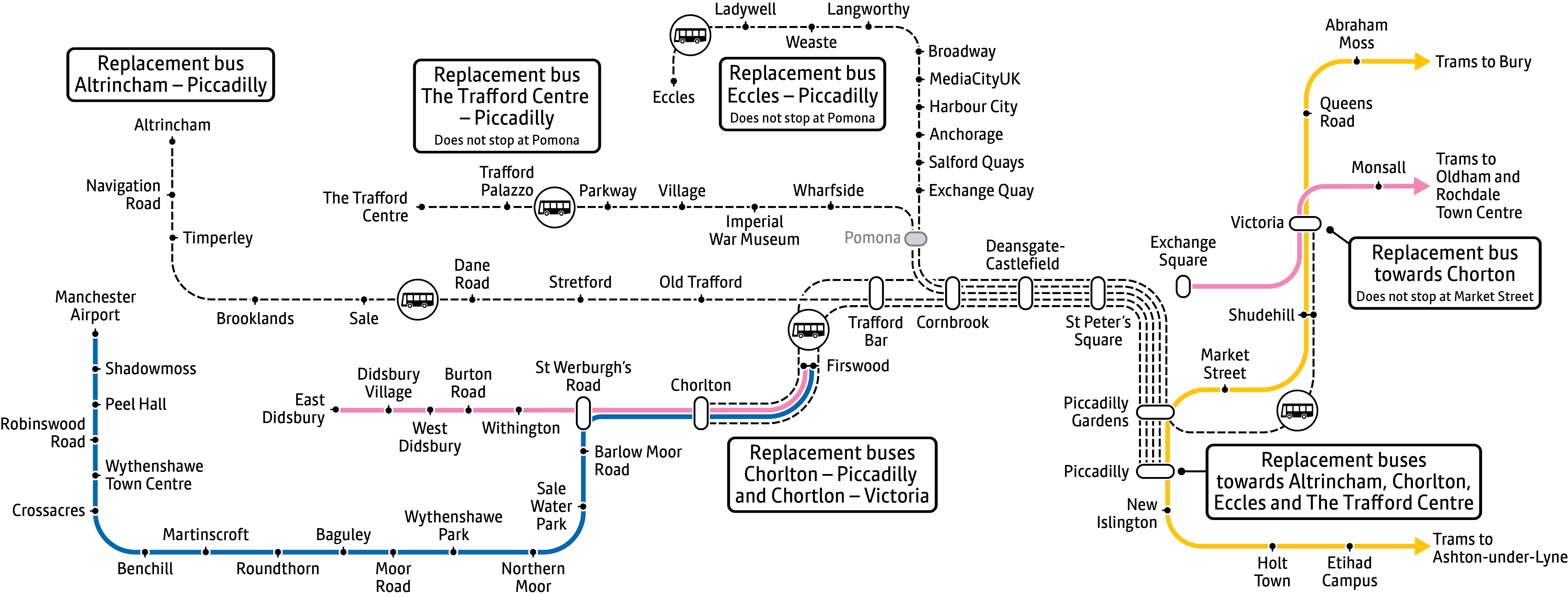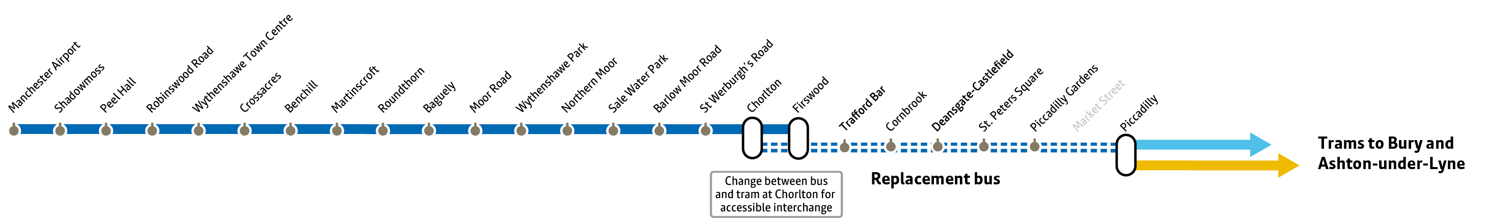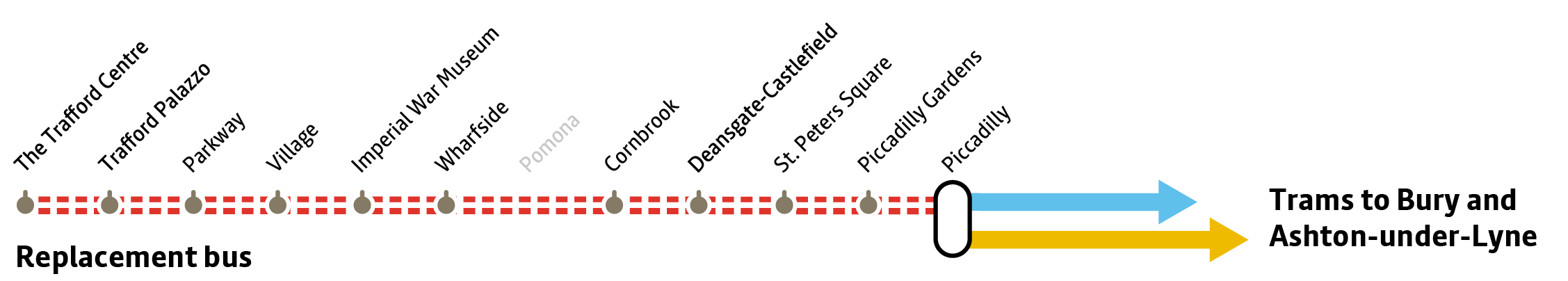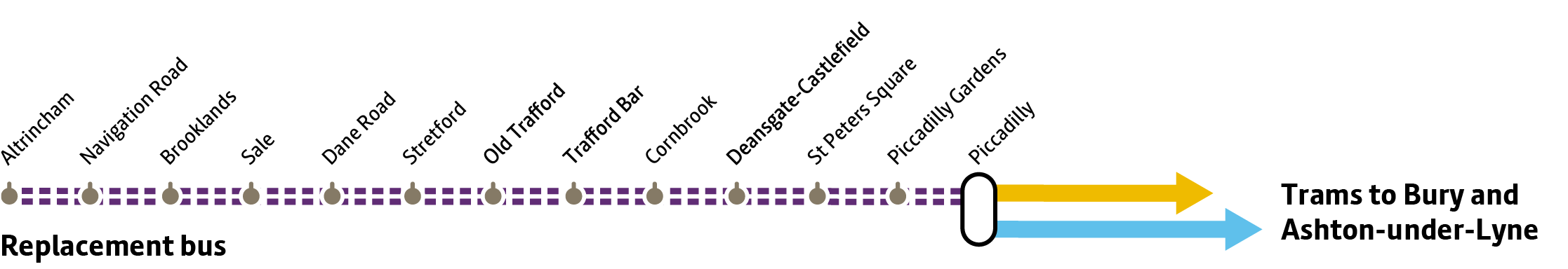 During peak times on Saturday, an additional express service will operate, providing a replacement bus service every 7.5 minutes between Altrincham, Timperley, Sale, Stretford and Piccadilly only.