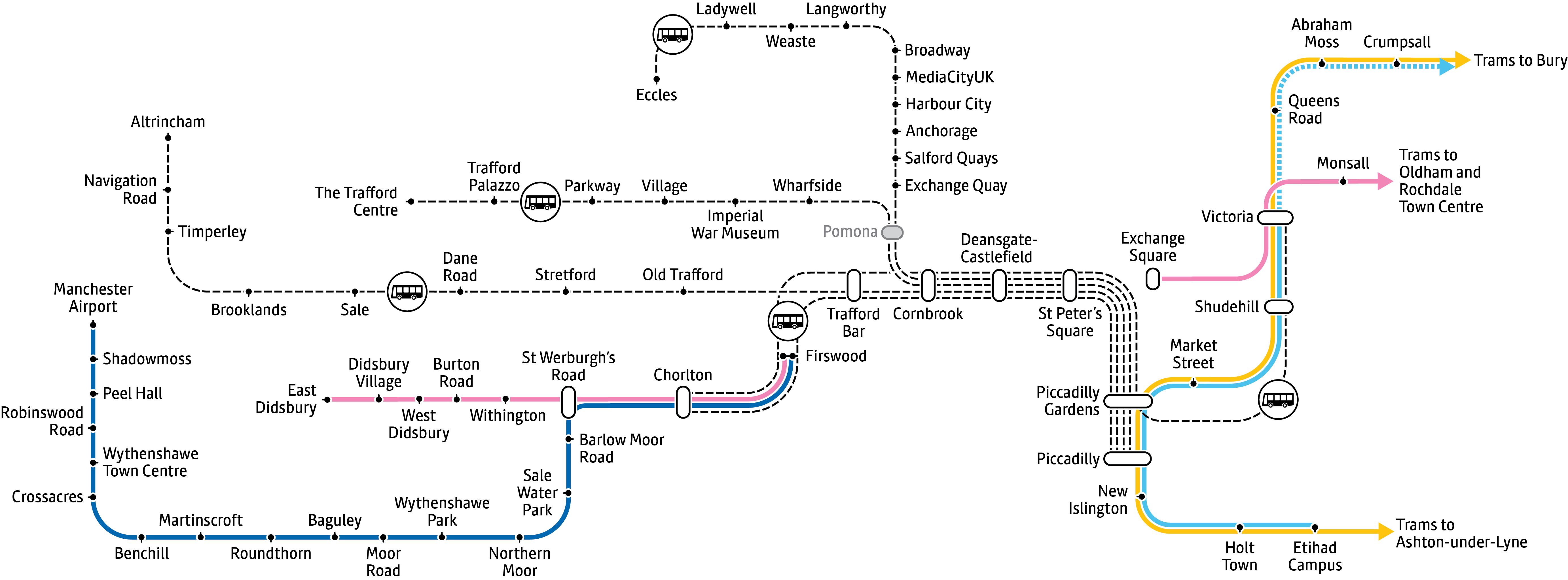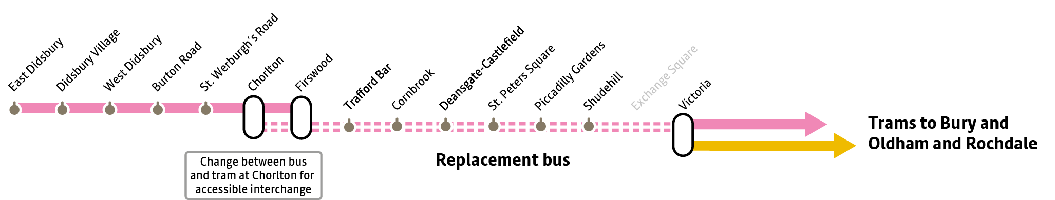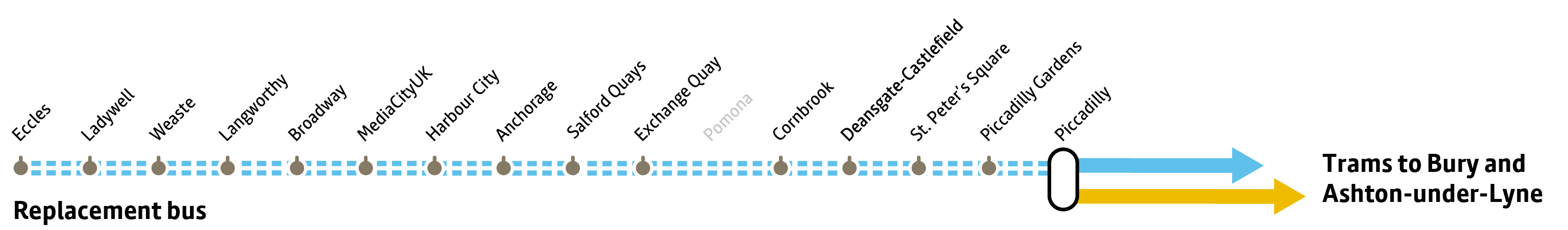 During peak times on Saturday, an additional express service will operate, providing a replacement bus service every 7.5 minutes between Altrincham, Timperley, Sale, Stretford and Piccadilly only.
