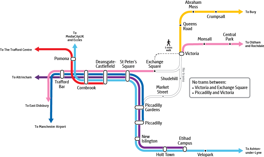 During this time, the Rochdale and Bury line will terminate at Victoria, while the East Didsbury line will terminate at Exchange Square.