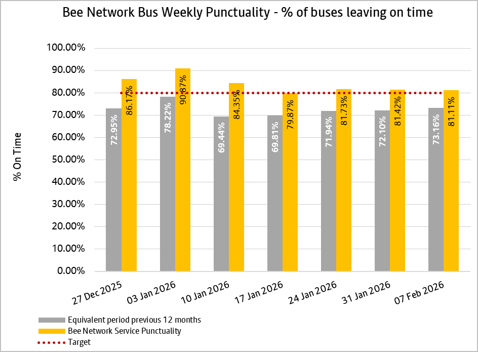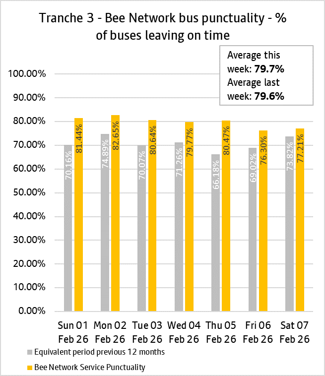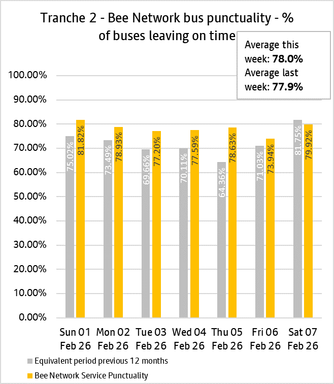 The daily punctuality data shows that Bee Network services were on time more often than compared with the same period as last year, over the period 1st and 7th February 2026.