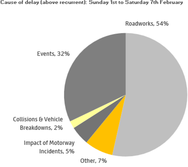 The main causes of delay (above recurrent) on highways over the seven days ending 7th February 2026 were: roadworks (54%), events (32%), other (7%), impact of motorway incidents (5%) and collisions and vehicle breakdown (2%).