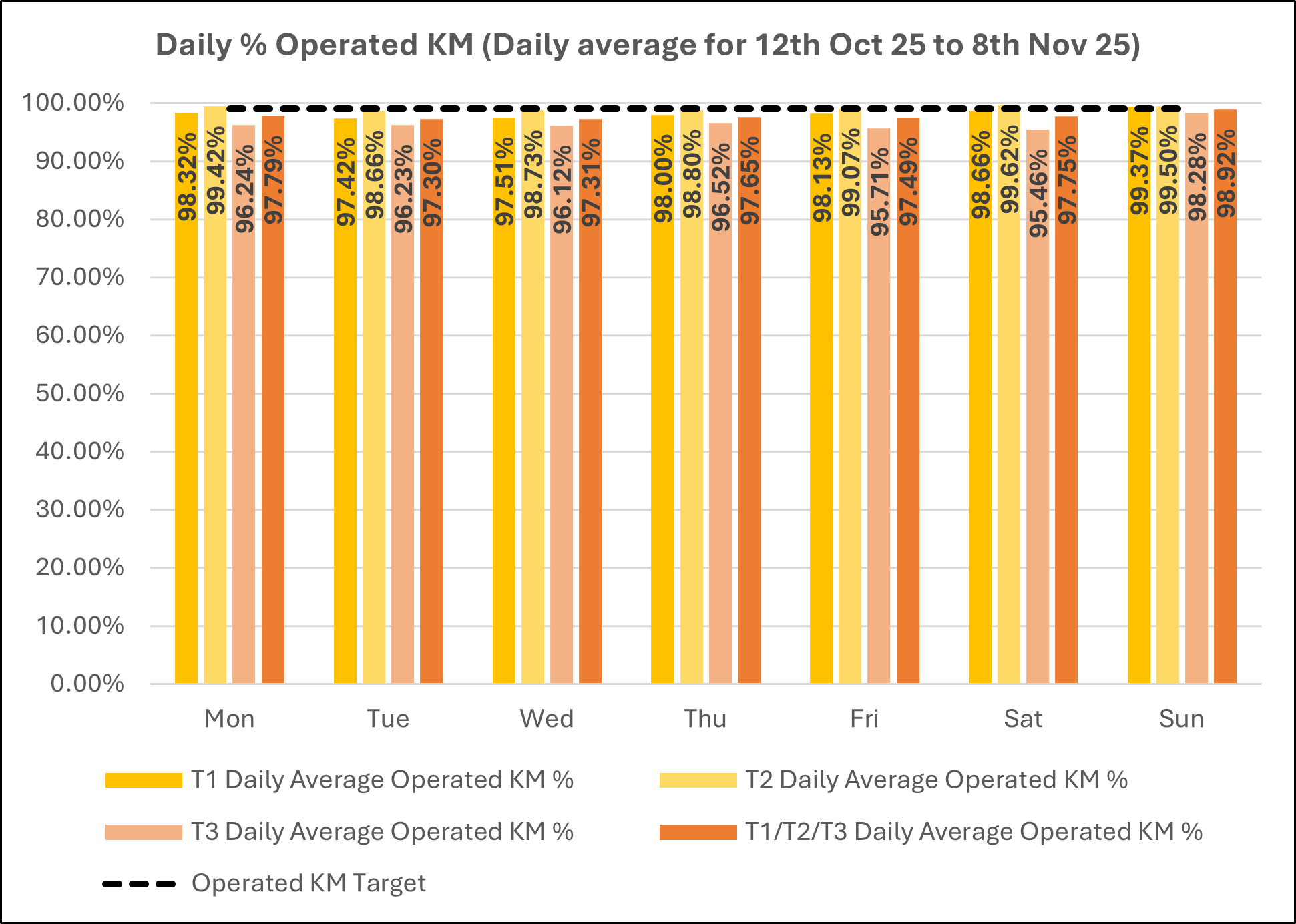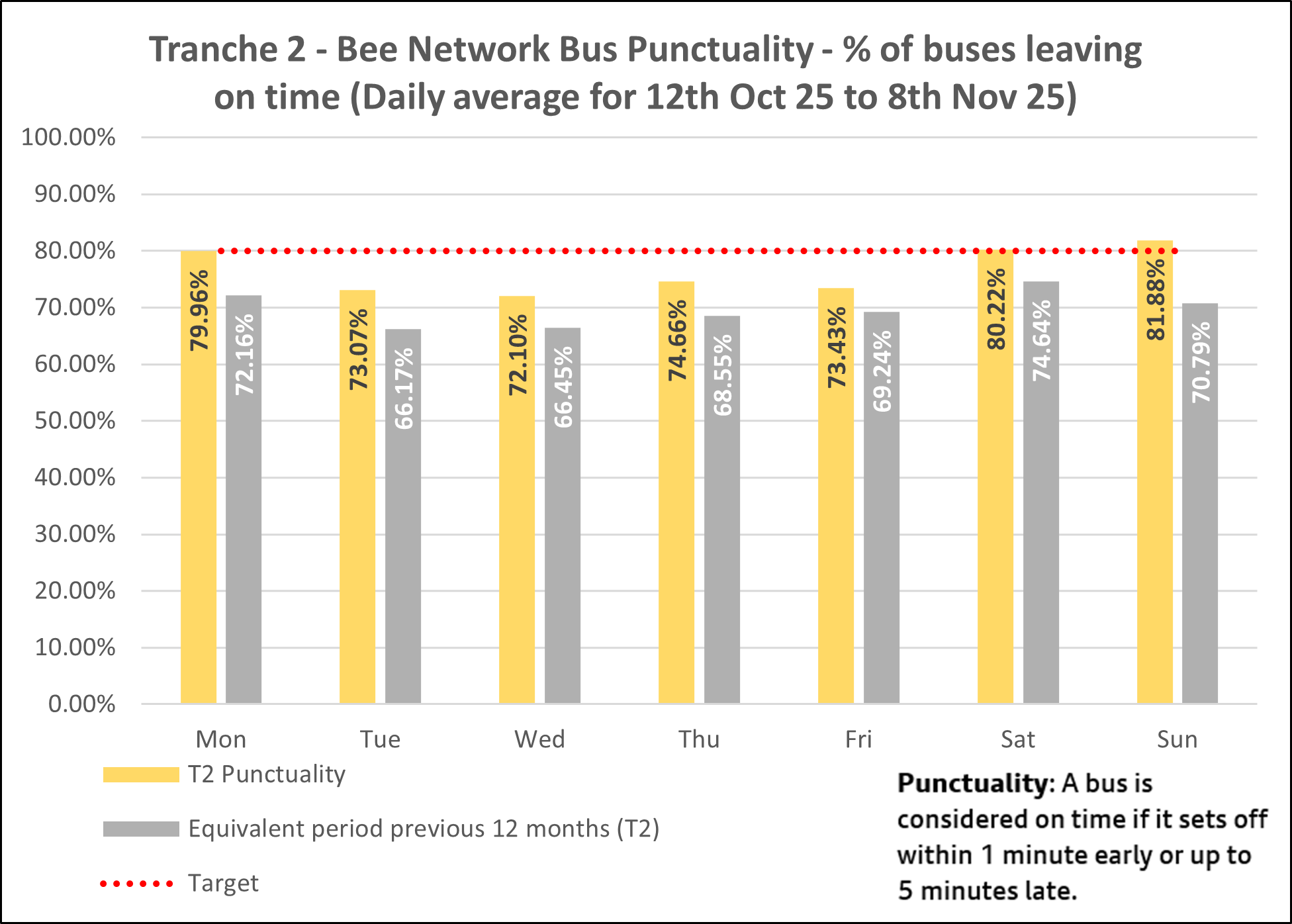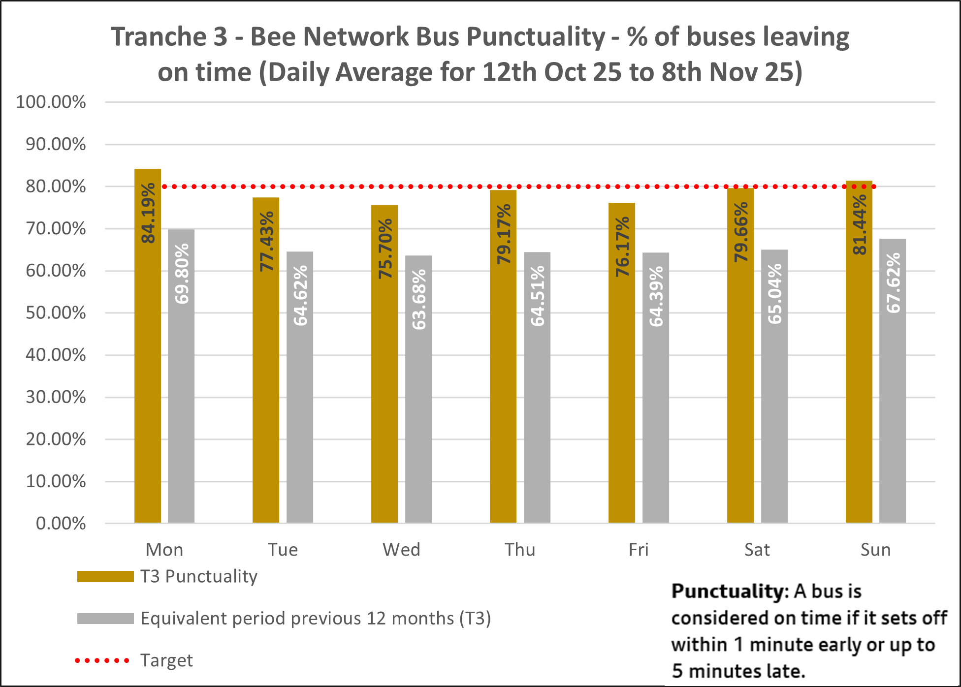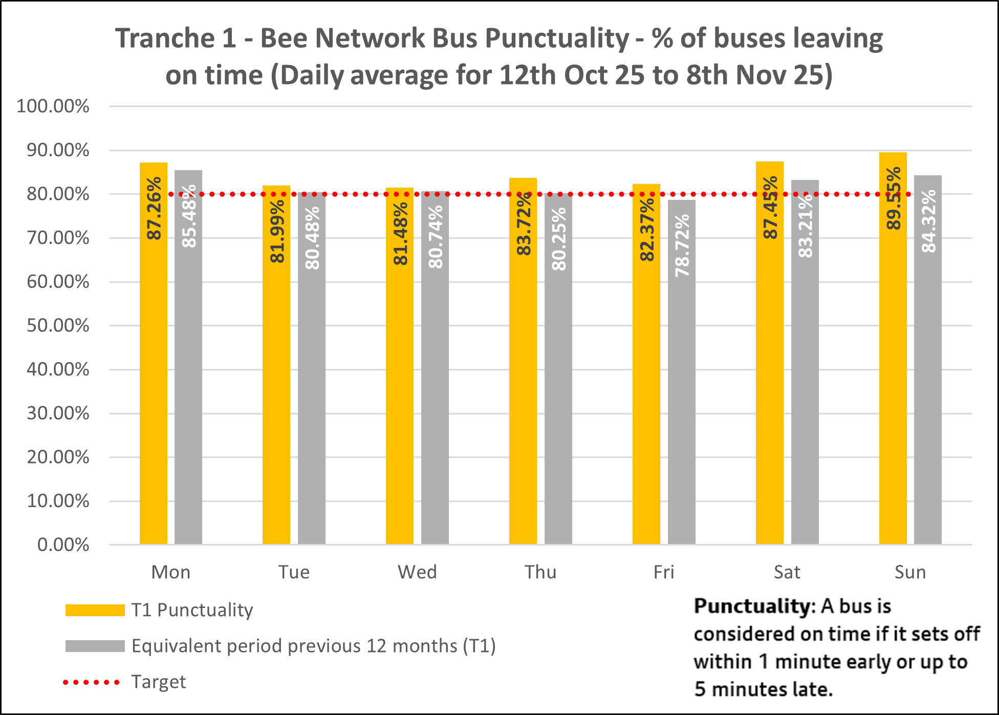 The chart below shows average daily punctuality data for all Bee Network services between 12th October and 8th November 2025.