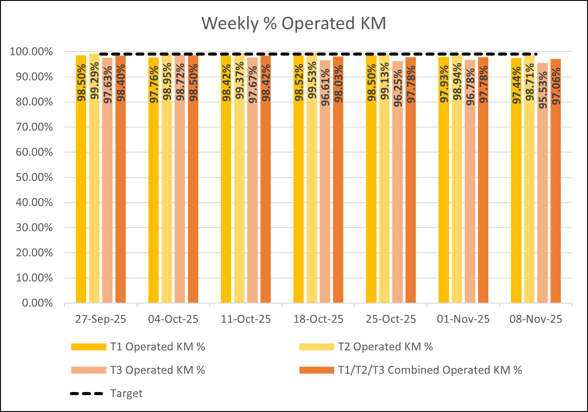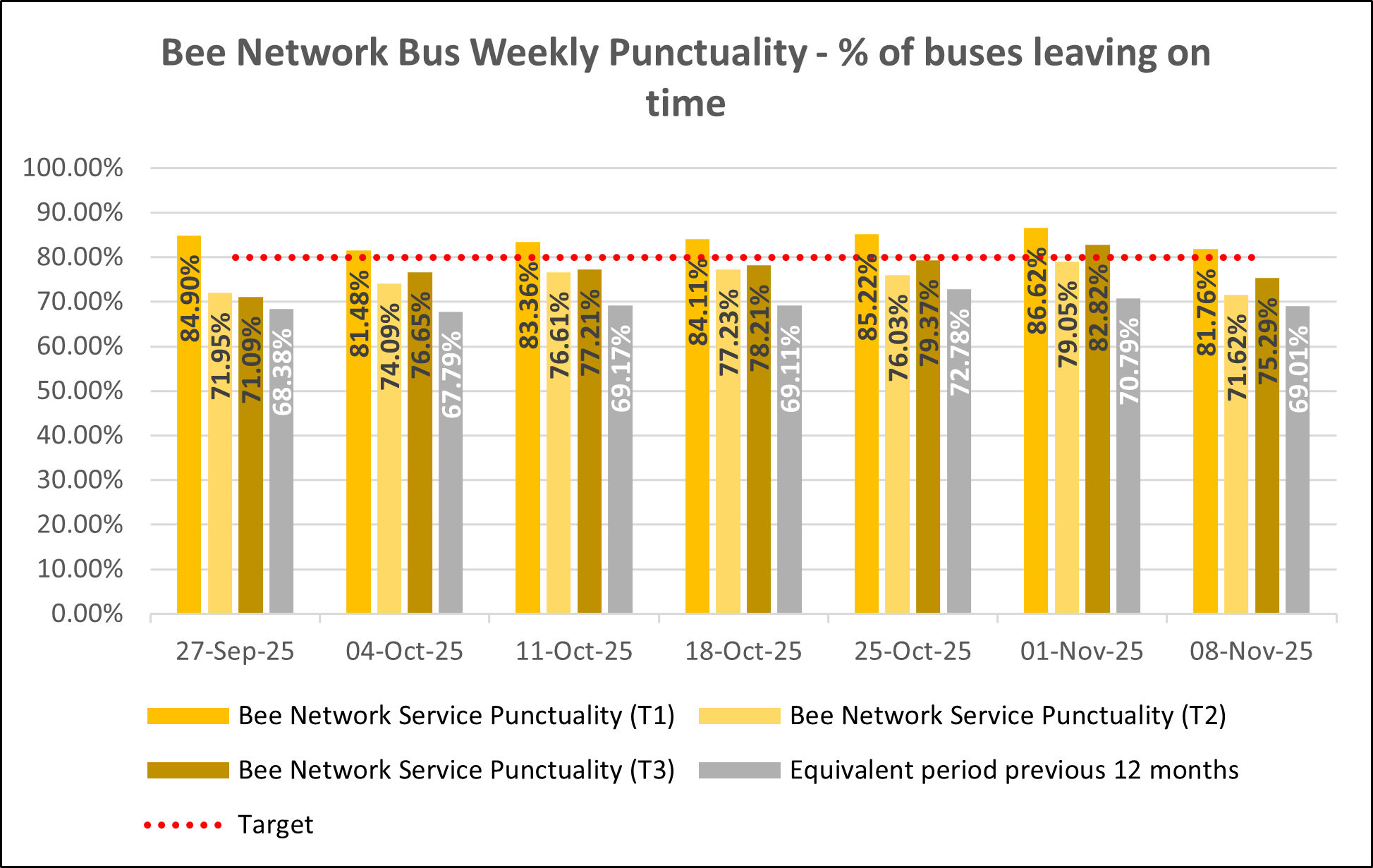 The chart below shows average weekly punctuality data for all Bee Network services from the week ending 27th September to the week ending 8th November 2025.