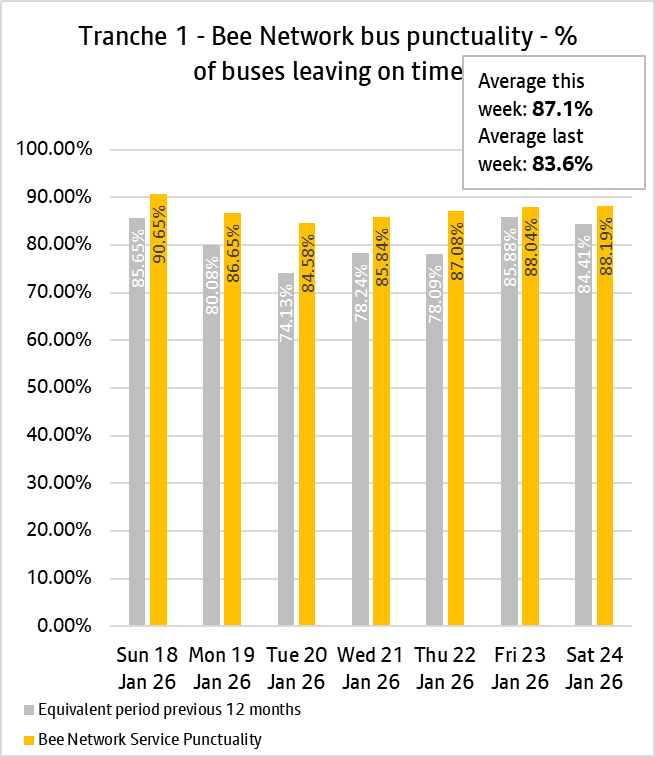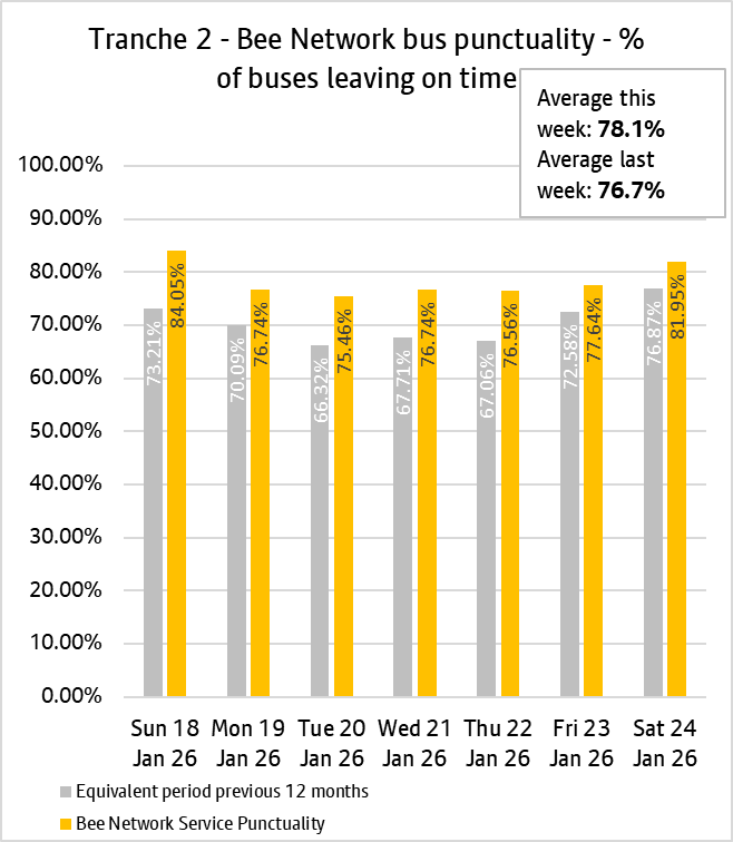 The daily punctuality data shows that Bee Network services were on time more often than compared with the same period as last year, over the period 18th and 24th January 2026.