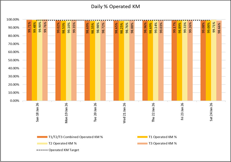 The chart shows daily % of operated KM for all Bee Network Services between 18th and 24th January 2026, based on data provided by the bus operators. The % of operated KM was above 98% each day last week.
