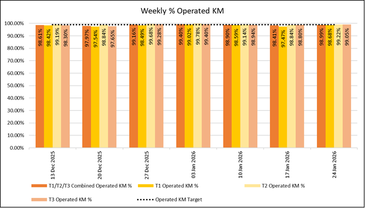 The weekly % of operated KM has been above 98% for all the Bee Network services on 5 of the last 6 weeks, with the level at 99.0% overall last week.
