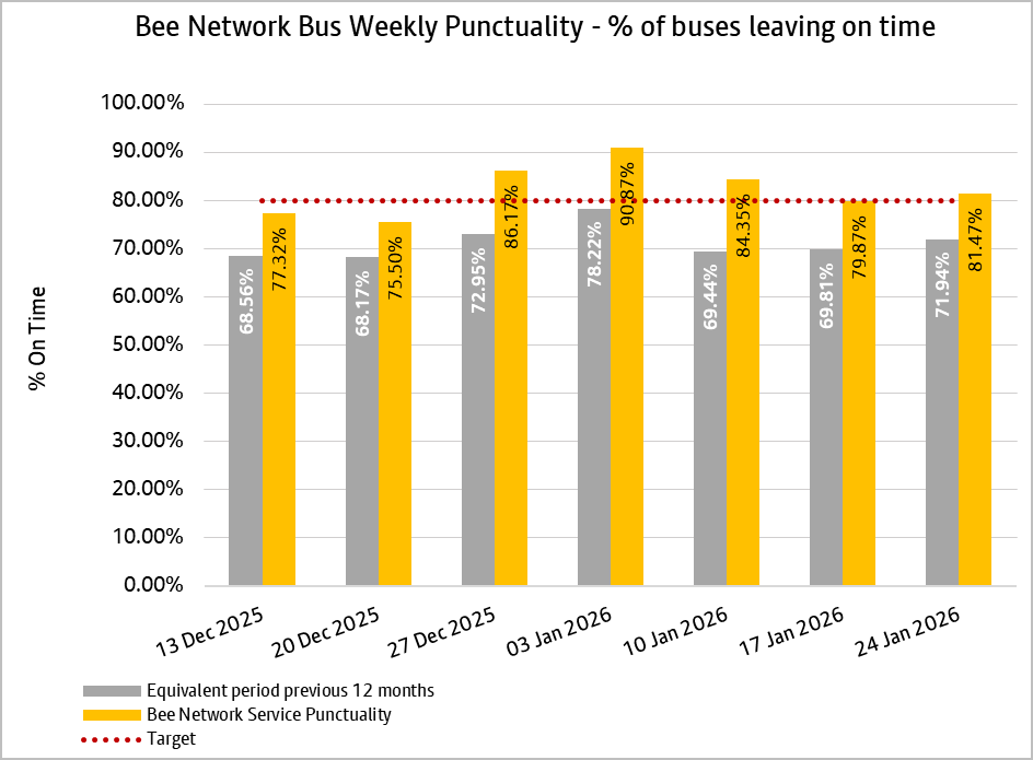 This weekly punctuality data shows that Bee Network services, since the week ending 13th December, have been on time more often when compared with the same period last year.