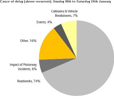 The main causes of delay (above recurrent) on highways over the seven days ending 24th January 2026 were: roadworks (74%), other (16%), collisions, and vehicle breakdown (7%), impact of motorway incidents (6%) and events (4%).