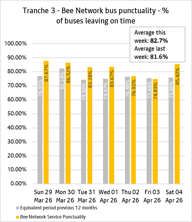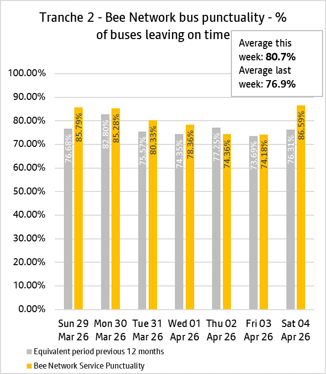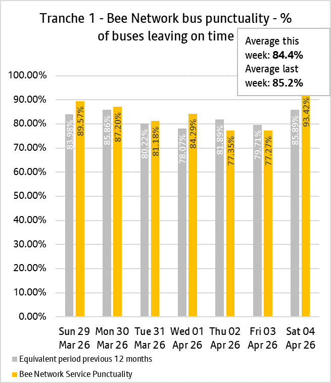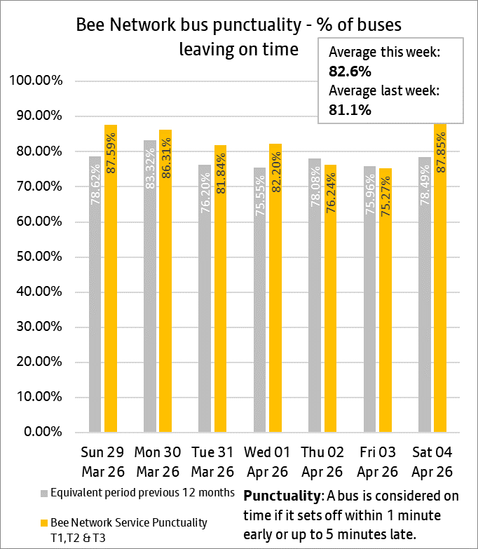 The daily punctuality data shows that Bee Network services were on time more often than compared with the same period as last year, over the period 29th March and 4th April 2026.