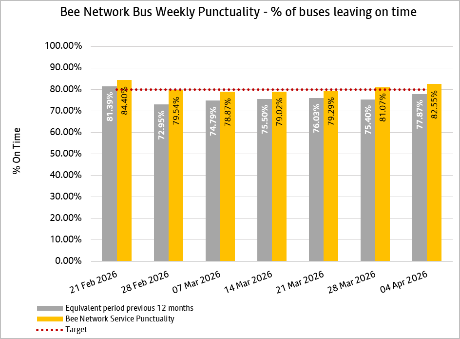 Bee Network bus punctuality was above target at 82.6% during the week leading up to Easter, despite a number of incidents, roadworks, road and lane closures on the strategic road network.