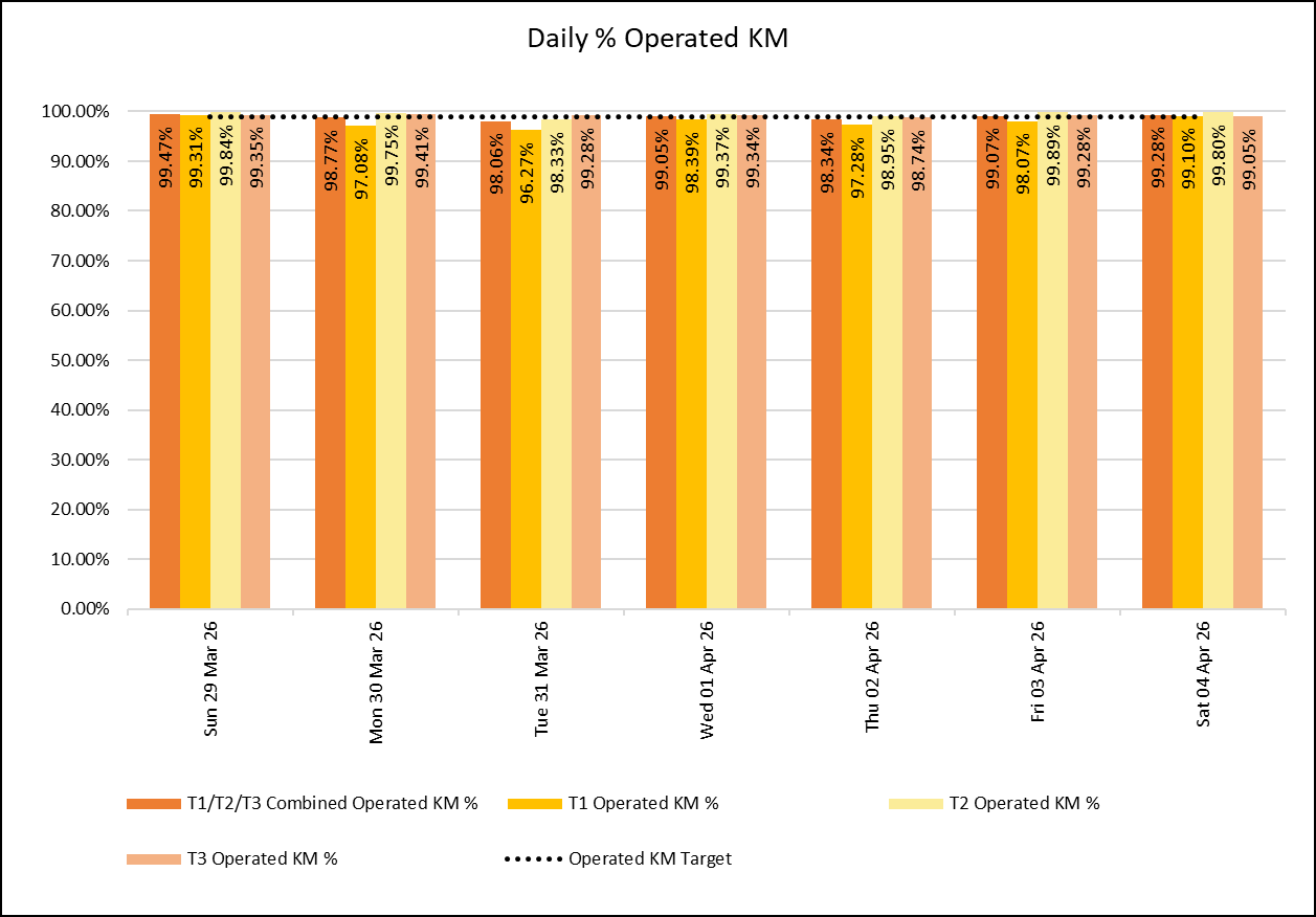 The chart shows daily % of operated KM for all Bee Network Services between 29th March and 4th April 2026. The % of operated KM was above 98% each day last week.