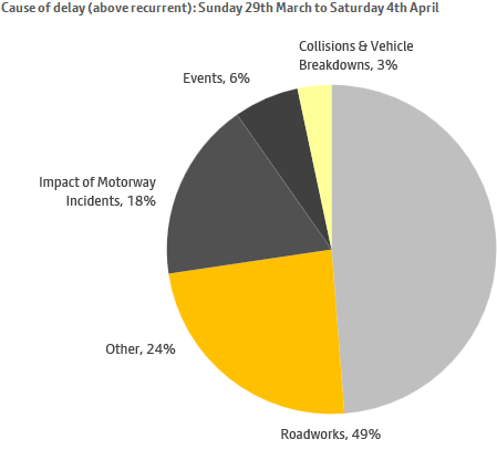 The main causes of delay (above recurrent) on highways over the seven days ending 4th April 2026 were: roadworks (49%), other (24%), impact of motorway incidents (18%), events (6%) and collisions & vehicle breakdown (3%).
