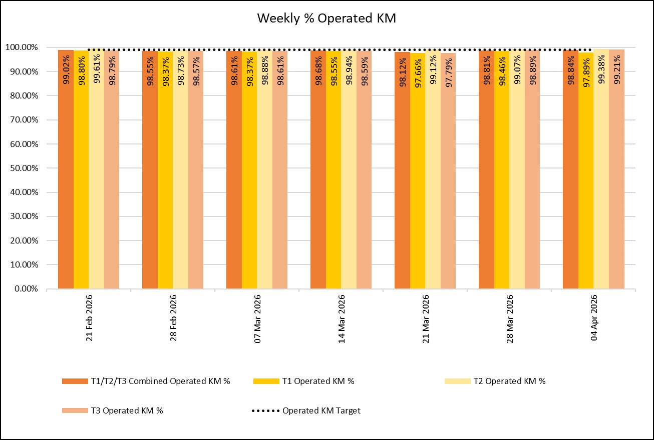 The chart shows weekly % of operated KM for all Bee Network Services between the week ending 21st February 2026 to the week ending 4th April 2026. The weekly % of operated KM has been above 98% for all the Bee Network services over the last 6 weeks, with the level at 98.8% overall last week.