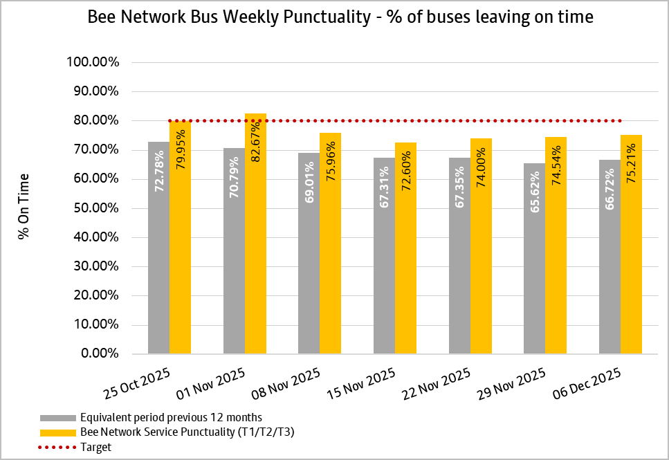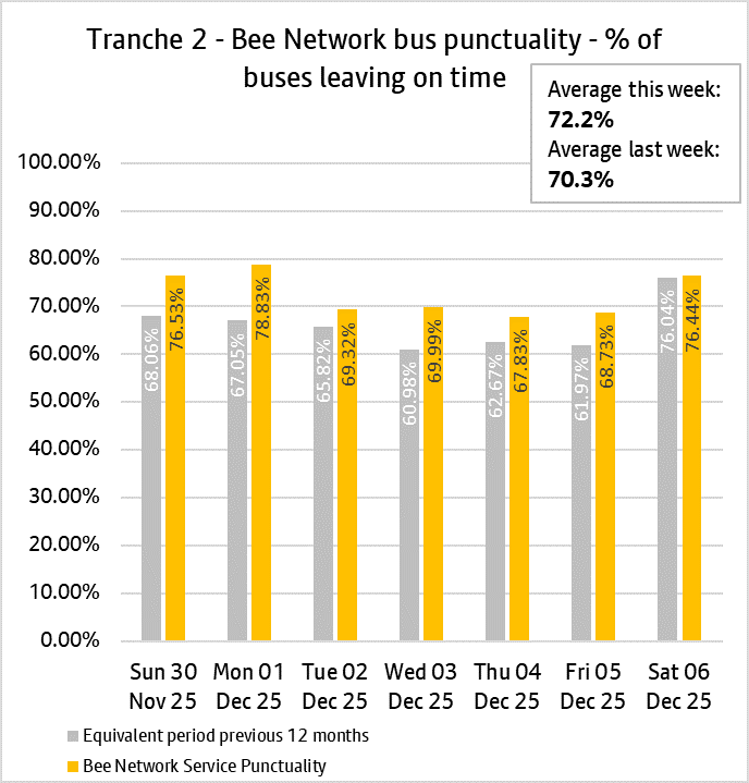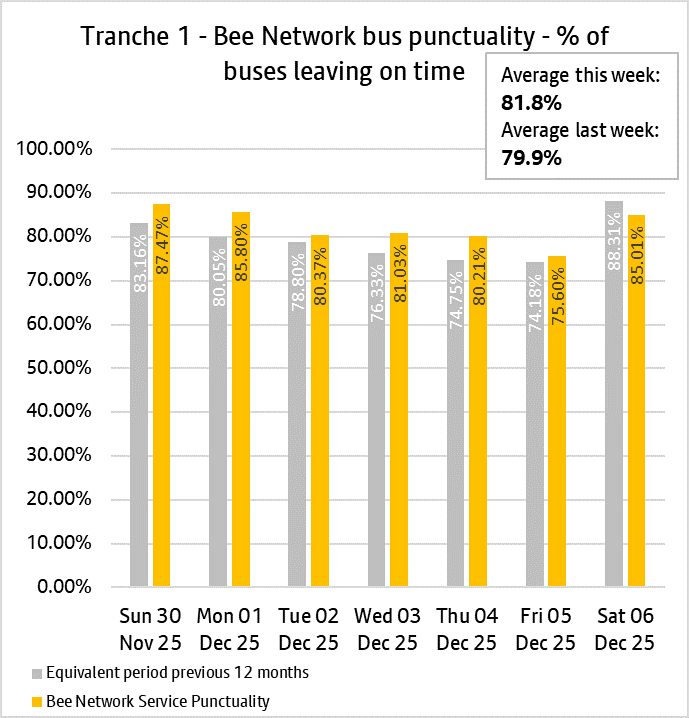 The daily punctuality data shows that Bee Network services were on time more often than compared with the same period as last year, over the period 30th November and 6th December 2025.
