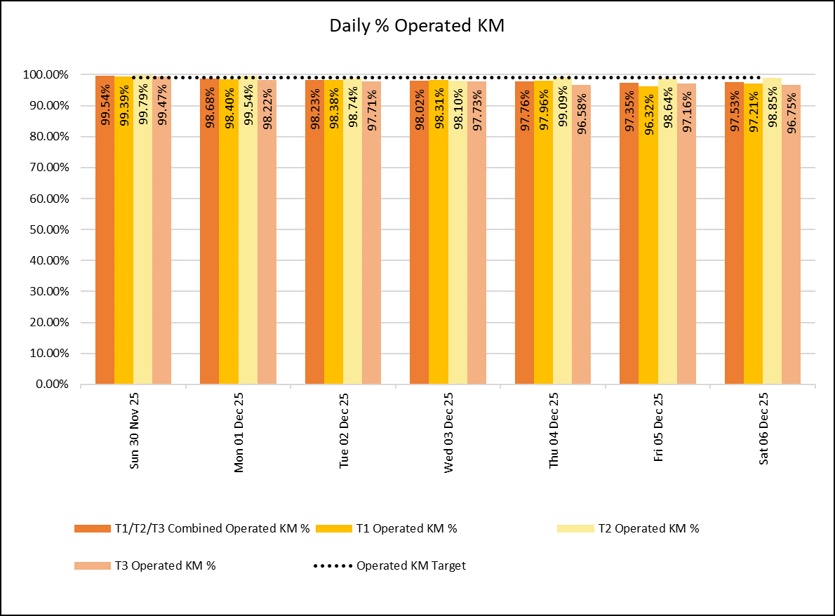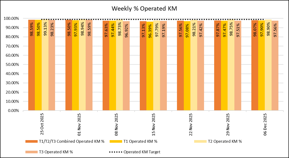 The weekly % of operated KM has been above 98% for all the Bee Network services on 3 of the last 6 weeks, with the level at 98.1% overall last week.