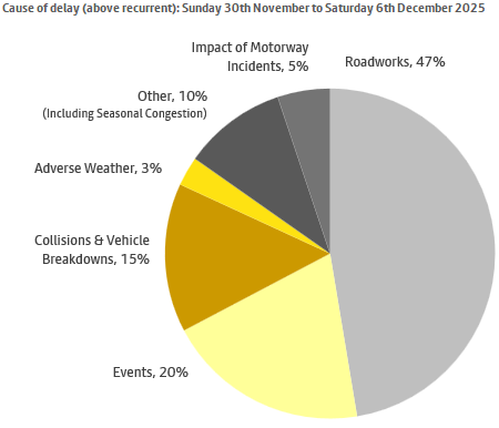 The main causes of delay (above recurrent) on highways over the seven days ending 6th December 2025 were: roadworks (47%), events (20%), other (including seasonal congestion, 10%), collisions and vehicle breakdown (15%), impact of motorway incidents (5%) and adverse weather (3%).